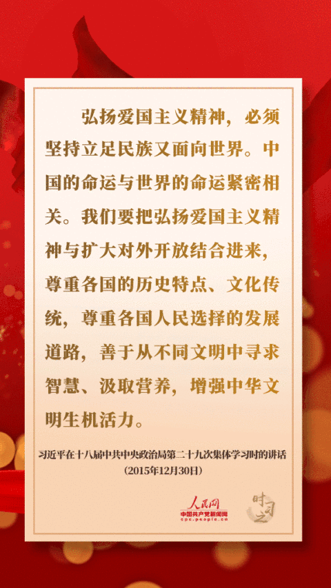 弘揚(yáng)愛國主義精神,必須堅(jiān)持立足民族又面向世界。中國的命運(yùn)與世界的命運(yùn)緊密相關(guān)。我們要把弘揚(yáng)愛國主義精神與擴(kuò)大對外開放結(jié)合進(jìn)來,尊重各國的歷史特點(diǎn)、文化傳統(tǒng),尊重各國人民選擇的發(fā)展道路,善于從不同文明中尋求智慧、汲取營養(yǎng),增強(qiáng)中華文明生機(jī)活力。
