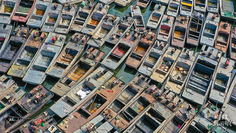 △國家實施長江流域禁捕退捕政策后,江蘇宿遷泗洪縣啟動洪澤湖水域禁捕退捕和住家船整治工作。這是聚集在漁港等待拆解的漁船。