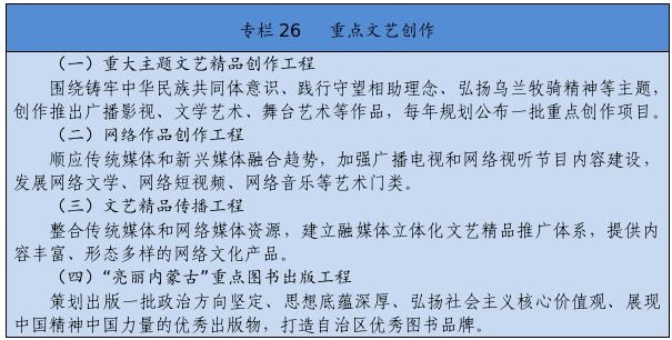 堅(jiān)持以人民為中心的創(chuàng)作導(dǎo)向,創(chuàng)作生產(chǎn)出人民喜聞樂見的優(yōu)秀作品。繁榮發(fā)展新聞出版、廣播影視、文學(xué)藝術(shù),實(shí)施文藝作品質(zhì)量提升工程,加強(qiáng)優(yōu)秀劇本孵化和生活采風(fēng)。推動重大主題文藝精品創(chuàng)作,加強(qiáng)現(xiàn)實(shí)題材創(chuàng)作生產(chǎn)。改進(jìn)重點(diǎn)作品創(chuàng)作引導(dǎo)機(jī)制,建立重點(diǎn)文化藝術(shù)項(xiàng)目滾動扶持機(jī)制。設(shè)立內(nèi)蒙古文化藝術(shù)發(fā)展專項(xiàng)資金。加強(qiáng)文化文藝場館建設(shè)。制定文藝人才發(fā)展規(guī)劃,開展內(nèi)蒙古電影新導(dǎo)演計(jì)劃。實(shí)施文化潤心工程,以文藝創(chuàng)作鑄牢中華民族共同體意識。提升廣播電視和網(wǎng)絡(luò)視聽產(chǎn)品質(zhì)量,豐富網(wǎng)絡(luò)文藝內(nèi)容。搭建文藝精品遴選、展示、推出平臺,建設(shè)內(nèi)蒙古音樂廳,支持因地制宜建設(shè)綜合劇場、音樂廳和美術(shù)館,舉辦內(nèi)蒙古藝術(shù)節(jié)、內(nèi)蒙古音樂節(jié)等活動,大力實(shí)施文藝惠民演出和地方戲傳承創(chuàng)新工程,定期舉辦全區(qū)地方戲優(yōu)秀劇目展演以及音樂、舞蹈、小戲小品專業(yè)賽事,打造獨(dú)具特色的文化藝術(shù)品牌。