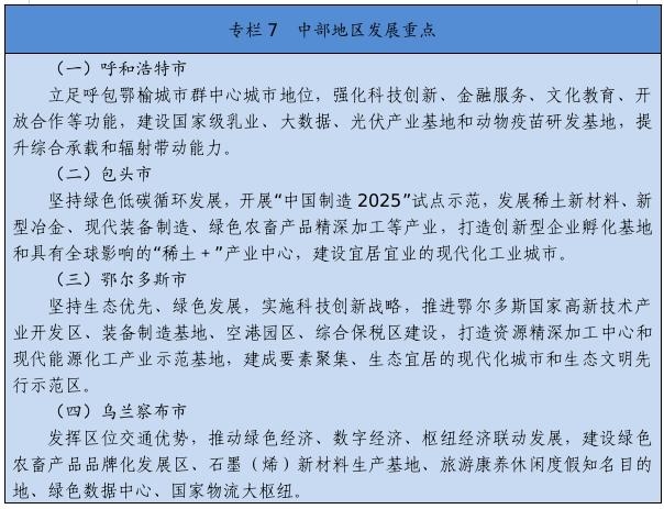 高標(biāo)準(zhǔn)打造稀土新材料、乳業(yè)國家技術(shù)創(chuàng)新中心,在優(yōu)勢特色產(chǎn)業(yè)領(lǐng)域培育一批國家重點(diǎn)實(shí)驗(yàn)室,布局建設(shè)自治區(qū)重點(diǎn)實(shí)驗(yàn)室、工程研究中心、產(chǎn)業(yè)創(chuàng)新中心、技術(shù)創(chuàng)新中心,構(gòu)建形成創(chuàng)新平臺體系。高質(zhì)量建設(shè)呼包鄂國家自主創(chuàng)新示范區(qū)、鄂爾多斯國家可持續(xù)發(fā)展議程創(chuàng)新示范區(qū)和巴彥淖爾國家農(nóng)業(yè)高新技術(shù)產(chǎn)業(yè)示范區(qū)。重點(diǎn)實(shí)施國家級高新區(qū)“提質(zhì)進(jìn)位”行動,爭取包頭稀土、呼和浩特金山、鄂爾多斯三個國家級高新技術(shù)產(chǎn)業(yè)開發(fā)區(qū)在全國高新技術(shù)開發(fā)區(qū)排名晉升5個位次。開展自治區(qū)級高新區(qū)“促優(yōu)培育”行動,推動赤峰、阿拉善、通遼高新區(qū)升級國家級高新區(qū),打造若干創(chuàng)新資源集聚高地。高質(zhì)量推進(jìn)“科創(chuàng)中國”試點(diǎn)城市建設(shè),大力實(shí)施科技創(chuàng)新賦能行動,促進(jìn)科技經(jīng)濟(jì)深度融合。