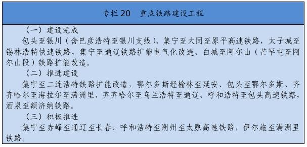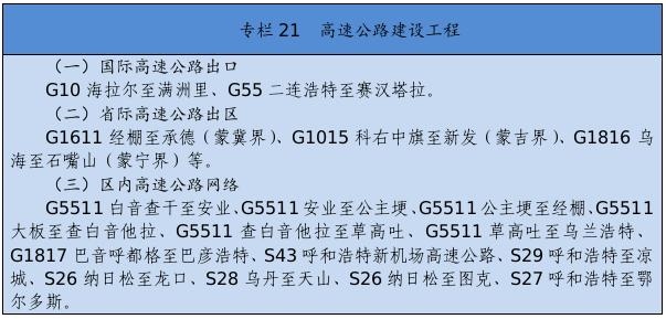 基礎(chǔ)設(shè)施保障更加有力。交通運(yùn)輸、能源外送通道和引調(diào)水骨干工程接續(xù)落地。綜合交通運(yùn)輸體系基本形成,接入全國高鐵網(wǎng),呼和浩特至張家口高速鐵路,通遼、赤峰至京沈高速鐵路連接線,浩勒報(bào)吉至吉安鐵路順利建成,建成高速鐵路404公里。全區(qū)103個旗縣(市區(qū))全部通高等級公路,京新高速臨河至哈密、丹錫高速錫林浩特至巴林右旗等高速公路通車運(yùn)營,所有鄉(xiāng)鎮(zhèn)(蘇木)和具備條件的建制村通硬化路,建成“四好農(nóng)村路”6.6萬公里,綜合交通網(wǎng)總里程達(dá)到22.5萬公里。呼和浩特新機(jī)場開工建設(shè),呼倫貝爾、包頭、通遼等機(jī)場完成改擴(kuò)建。新建通用機(jī)場15個,民用機(jī)場達(dá)到40個。黃河內(nèi)蒙古段二期防洪、引綽濟(jì)遼、東臺子水庫等重大水利工程建設(shè)順利推進(jìn)。全區(qū)5G基站突破1萬個。建成5條特高壓外送電通道??耸部蓑v至北京煤制氣管道投入運(yùn)營。呼和浩特地鐵1、2號線一期工程建成運(yùn)營。