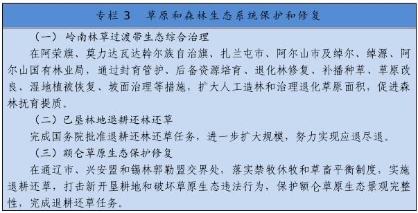 把保護(hù)草原、森林作為首要任務(wù),嚴(yán)格執(zhí)行基本草原保護(hù)制度,落實(shí)草原生態(tài)保護(hù)補(bǔ)助獎勵政策,完善草畜平衡和草原禁牧休牧制度。嚴(yán)禁在草原上亂采濫挖、新上礦產(chǎn)資源開發(fā)等工業(yè)項(xiàng)目,已批準(zhǔn)在建運(yùn)營的礦山、風(fēng)電、光伏等項(xiàng)目到期退出,新建風(fēng)電、光伏電站重點(diǎn)布局在沙漠荒漠、采煤沉陷區(qū)、露天礦排土場,推廣“光伏+生態(tài)治理”基地建設(shè)模式。開展草原生態(tài)承載能力核定和草原生態(tài)系統(tǒng)健康評價,實(shí)施草原保護(hù)和修復(fù)重大工程。科學(xué)開展大規(guī)模國土綠化行動,實(shí)施三北防護(hù)林體系建設(shè)、公益林保護(hù)、森林質(zhì)量精準(zhǔn)提升等工程,探索大興安嶺一體化保護(hù)模式,推進(jìn)已墾森林草原退耕還林還草,加強(qiáng)森林撫育和退化林修復(fù),提升生態(tài)系統(tǒng)質(zhì)量和穩(wěn)定性。加快構(gòu)建以國家公園為主體的自然保護(hù)地體系。