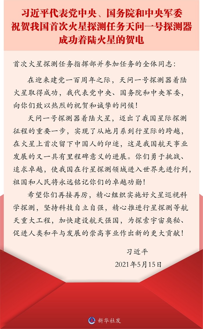 習(xí)近平在賀電中勉勵(lì)同志們堅(jiān)持科技自立自強(qiáng),精心推進(jìn)行星探測(cè)等航天重大工程,加快建設(shè)航天強(qiáng)國(guó)。