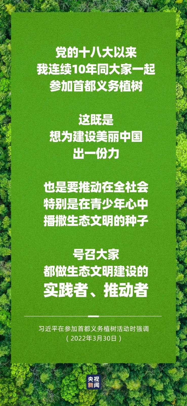中共中央總書記、國家主席、中央軍委主席習(xí)近平3月30日在參加首都義務(wù)植樹活動時強調(diào),黨的十八大以來,我連續(xù)10年同大家一起參加首都義務(wù)植樹,這既是想為建設(shè)美麗中國出一份力,也是要推動在全社會特別是在青少年心中播撒生態(tài)文明的種子,號召大家都做生態(tài)文明建設(shè)的實踐者、推動者,持之以恒,久久為功,讓我們的祖國天更藍、山更綠、水更清、生態(tài)環(huán)境更美好。