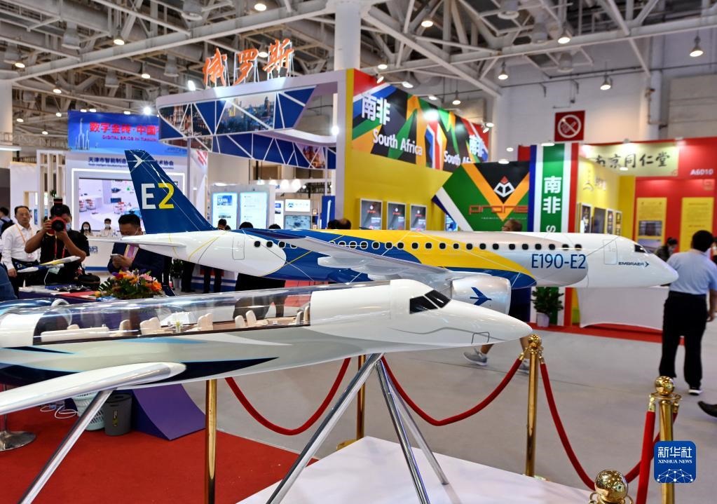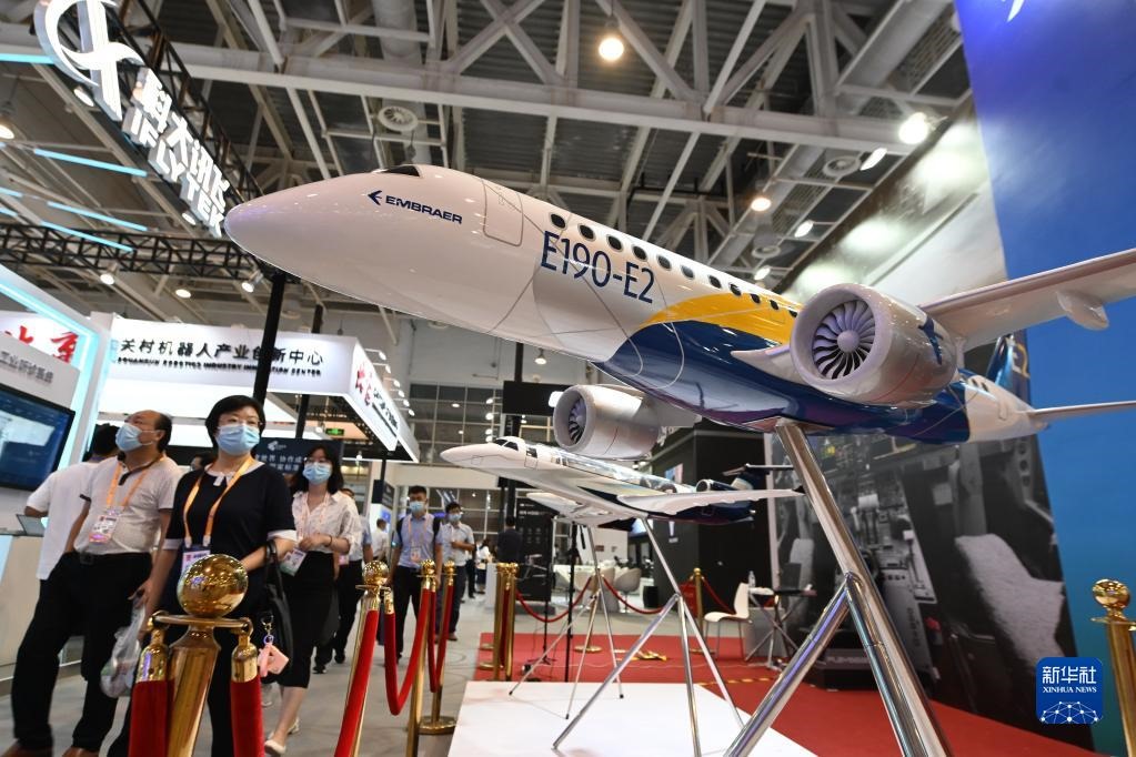 參觀者從2021金磚國家新工業(yè)革命展展出的飛機模型前走過(2021年9月8日攝)。新華社記者林善傳攝