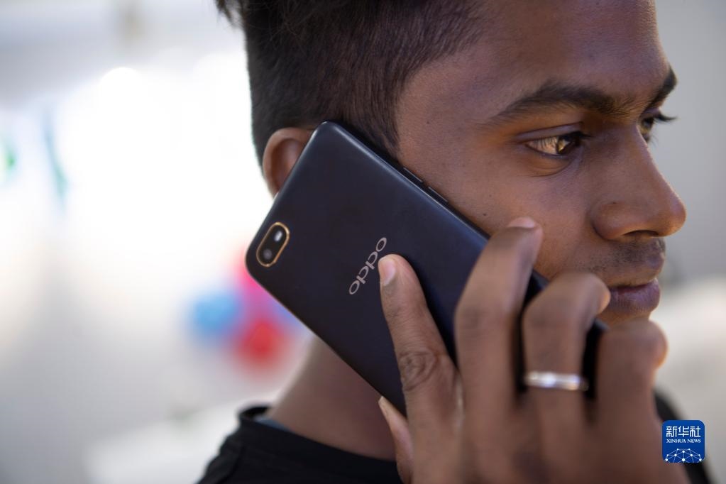2019年10月8日,一名男子在印度金奈的一家商場使用中國品牌的手機。新華社記者呂小煒攝