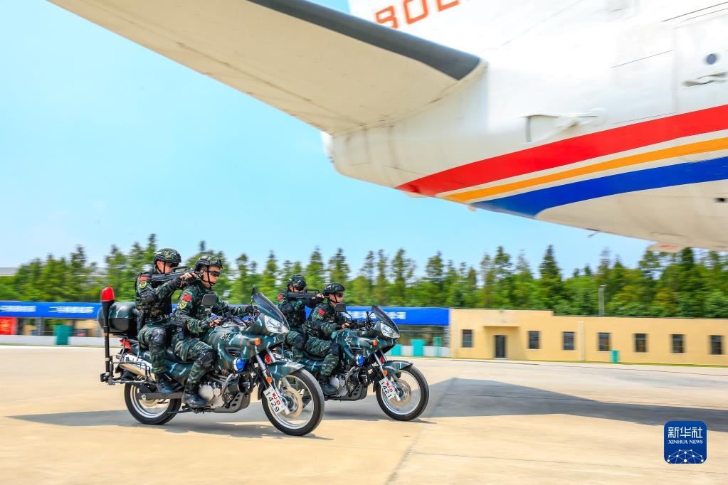 武警上??傟?duì)機(jī)動(dòng)第一支隊(duì)特戰(zhàn)某中隊(duì)組織交通工具反劫持綜合演練,特戰(zhàn)隊(duì)員乘坐摩托車(chē)接近“被劫持飛機(jī)”(2022年8月1日攝)。新華社發(fā)(李巖攝)