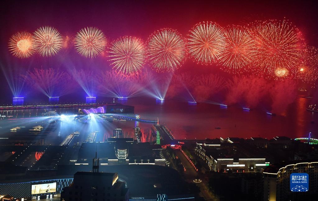 這是在青島舉行的《有朋自遠(yuǎn)方來(lái)》燈光焰火藝術(shù)表演(2018年6月9日晚攝)。2018年6月9日至10日,上海合作組織成員國(guó)元首理事會(huì)第十八次會(huì)議在青島召開。新華社記者李紫恒攝