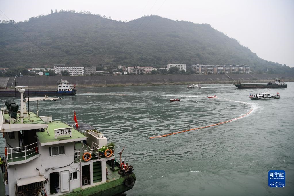 11月9日,在四川省宜賓市敘州區(qū)的長江流域突發(fā)生態(tài)環(huán)境事件應急綜合演練現場,多方部門協(xié)作在金沙江面布設圍油欄。新華社記者 王曦 攝