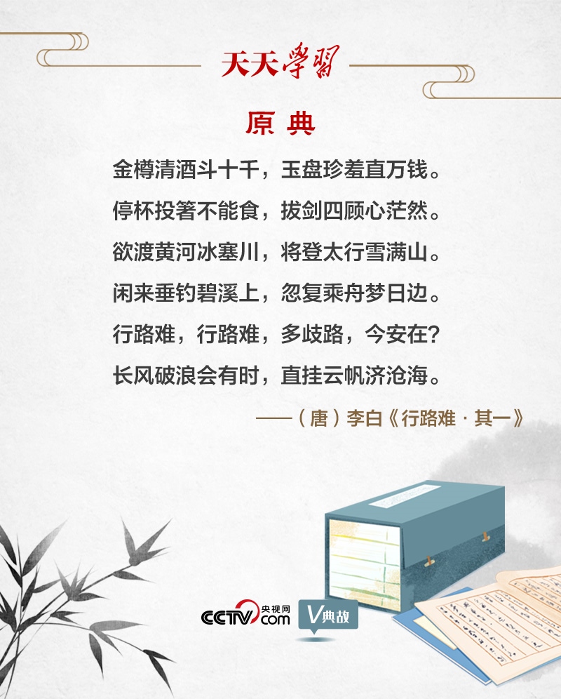 “行路難”為樂府古題,多詠嘆世路艱難及貧困孤苦的處境。李白的《行路難》共三首,“長風(fēng)破浪會有時”出自第一首。唐天寶元年(742年),李白奉詔入京,擔(dān)任翰林供奉。后因權(quán)臣讒毀排擠,被“賜金放還”?!缎新冯y》便是李白離開長安時所作。