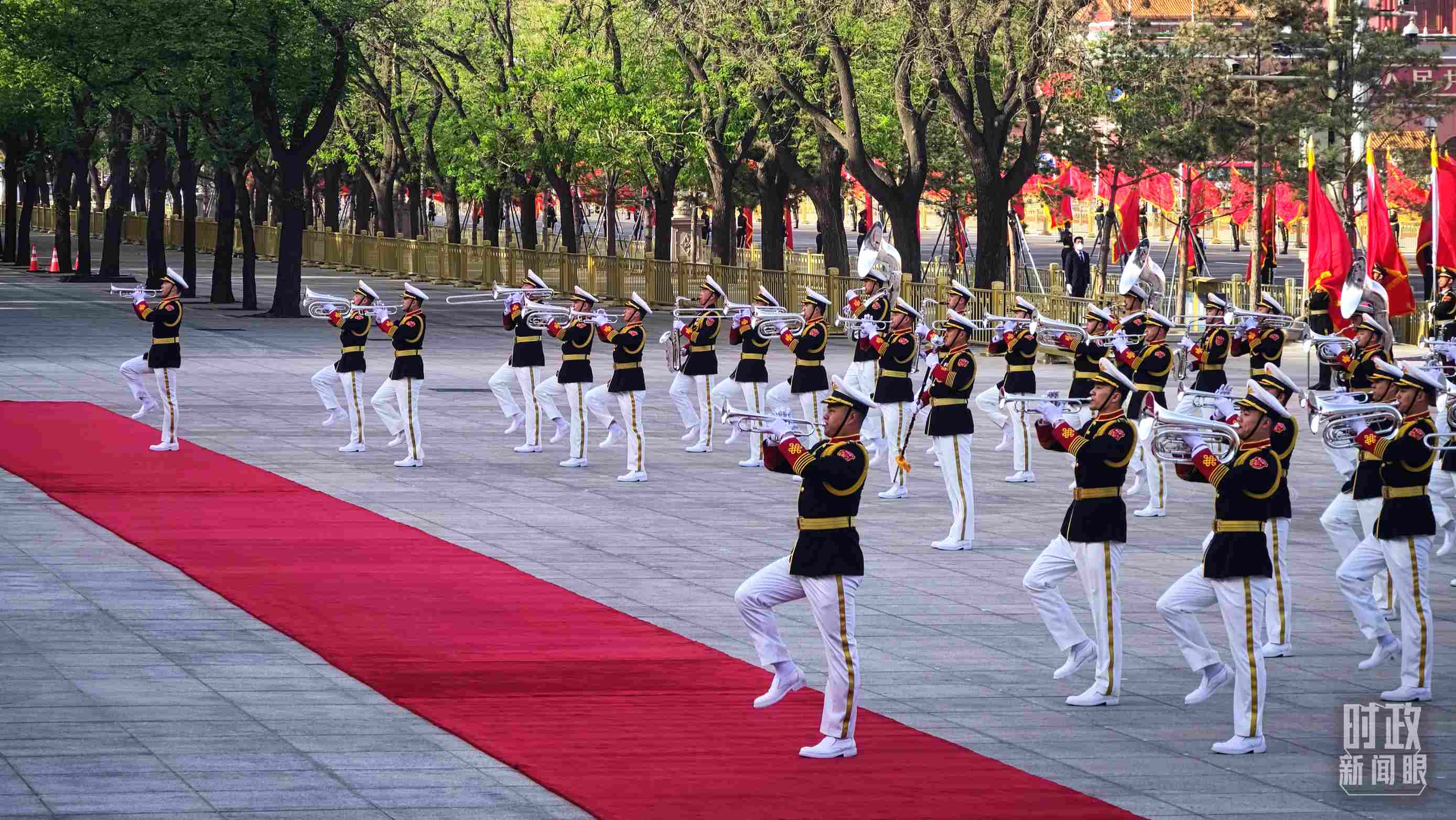 △歡迎儀式現(xiàn)場(chǎng)的軍樂(lè)團(tuán)正在進(jìn)行行進(jìn)吹奏表演。(總臺(tái)央廣記者潘毅拍攝)