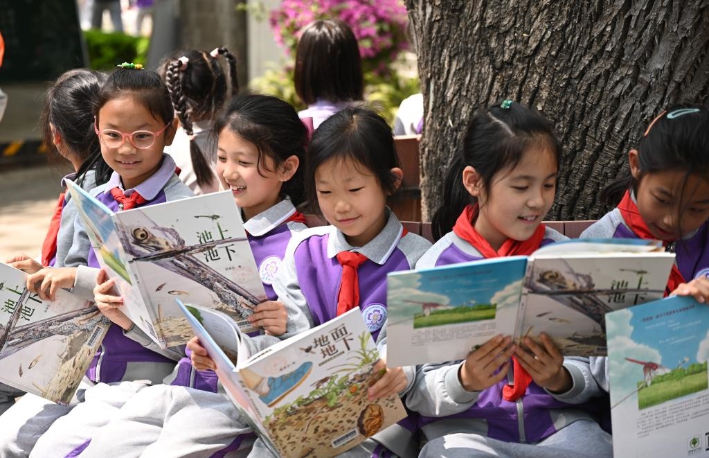 在她的校園里,有一棵“長(zhǎng)滿書的大樹”,掛滿了《神筆馬良》《西游記》《可愛(ài)的中國(guó)》等經(jīng)典書籍。教學(xué)樓走廊里、教室里,隨處可見(jiàn)各種圖書。踏著閱讀的階梯,祖國(guó)的花朵茁壯成長(zhǎng)。