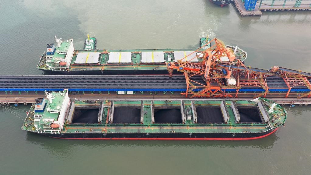 5月11日,船舶??吭邳S驊港煤炭港區(qū)碼頭(無人機照片)。新華社記者 駱學峰 攝