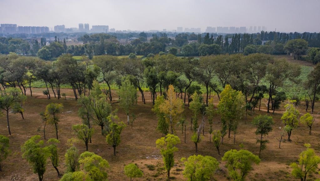 2020年9月27日拍攝的陜西省靖邊縣城旁的西草灘濕地公園(無(wú)人機(jī)照片)。新華社記者 陶明 攝