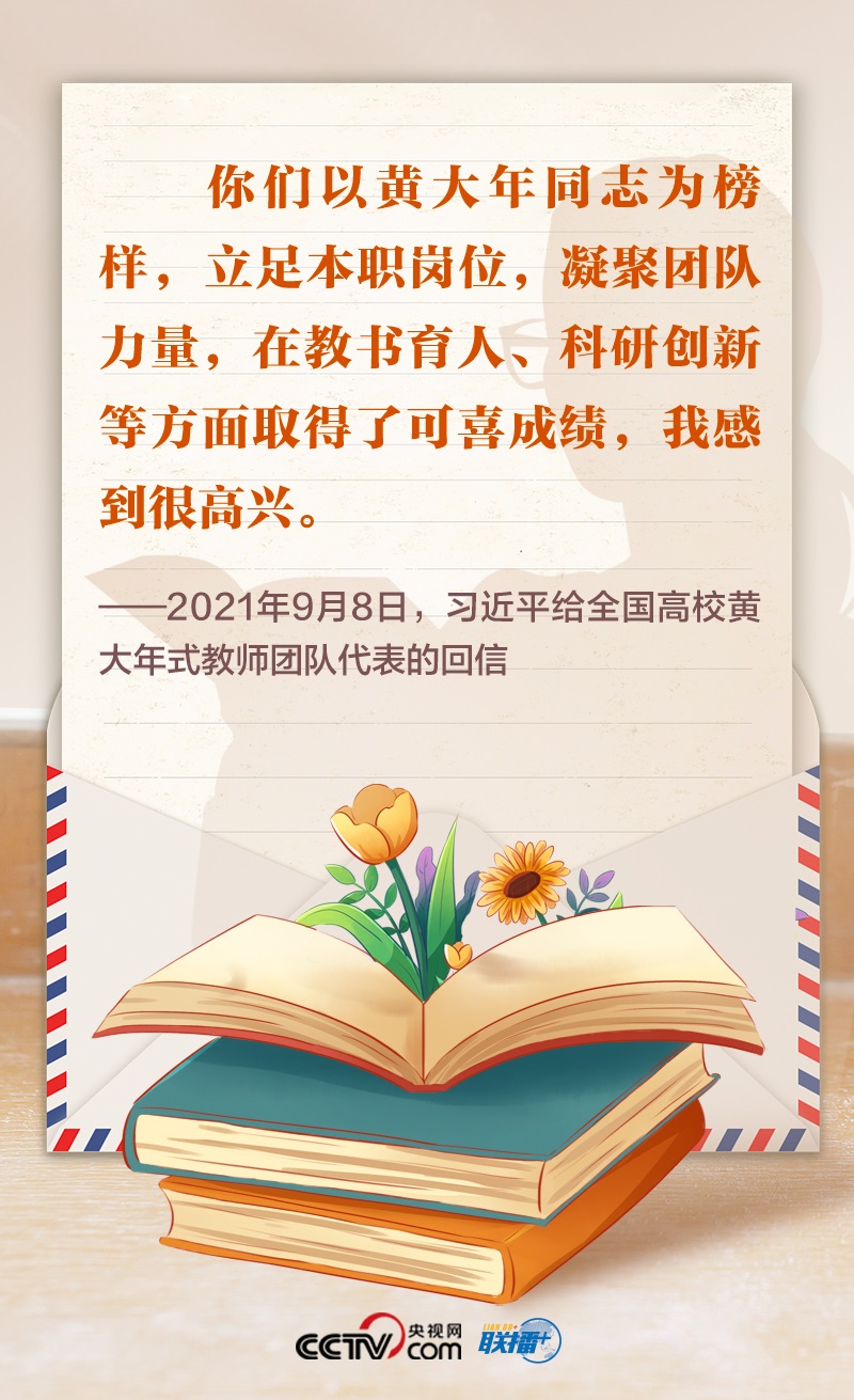 2021年,首批黃大年式教師團(tuán)隊(duì)的代表給總書(shū)記寫(xiě)信,匯報(bào)教學(xué)、科研等工作情況,表達(dá)了堅(jiān)守教育報(bào)國(guó)理想、為民族復(fù)興貢獻(xiàn)力量的決心??倳?shū)記回信肯定了大家的工作成效,勉勵(lì)大家繼續(xù)學(xué)習(xí)弘揚(yáng)黃大年同志等優(yōu)秀教師的高尚精神,立德修身,潛心治學(xué),開(kāi)拓創(chuàng)新,真正把為學(xué)、為事、為人統(tǒng)一起來(lái),當(dāng)好學(xué)生成長(zhǎng)的引路人。