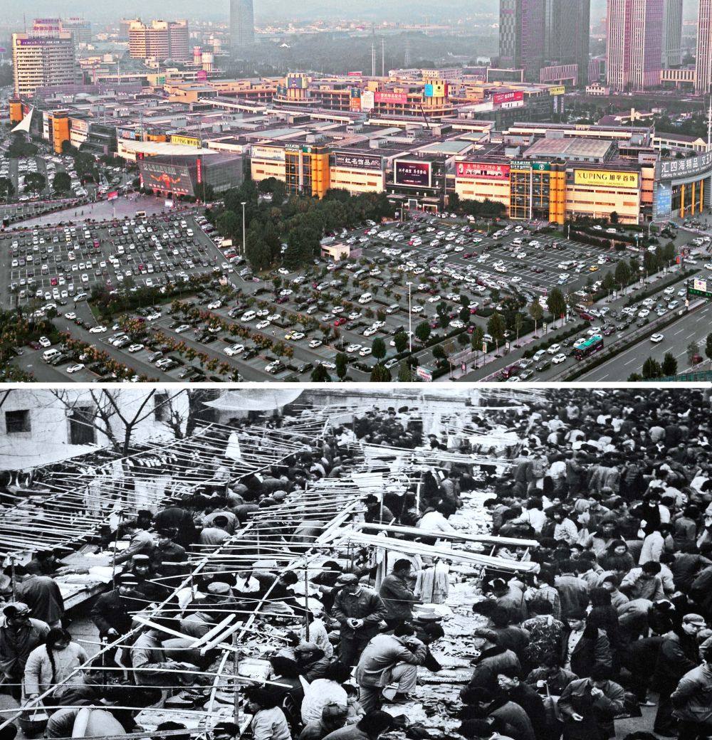 2018年拍攝的義烏國際商貿(mào)城一區(qū)市場(chǎng)(上)和1982年9月開業(yè)的義烏第一代小商品市場(chǎng)(下)。