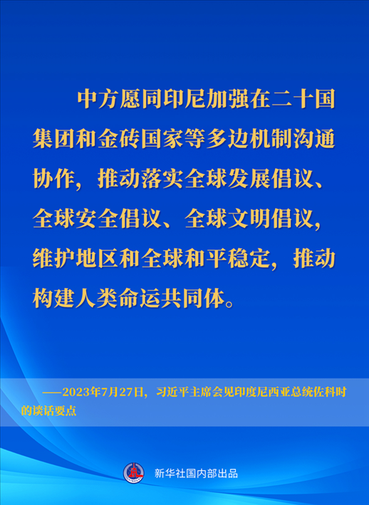 7月27日下午,國(guó)家主席習(xí)近平在成都會(huì)見來華出席第31屆世界大學(xué)生夏季運(yùn)動(dòng)會(huì)開幕式并訪華的印度尼西亞總統(tǒng)佐科。一起來看習(xí)近平主席在會(huì)見時(shí)的談話要點(diǎn)↓