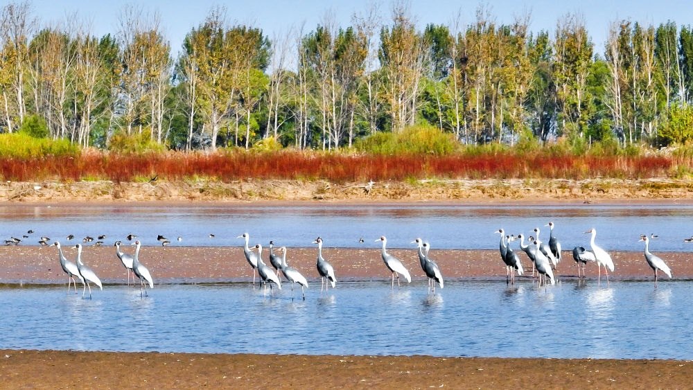 在山東黃河三角洲國(guó)家級(jí)自然保護(hù)區(qū)拍攝的白枕鶴(2022年10月18日攝)。新華社發(fā)(楊斌 攝)