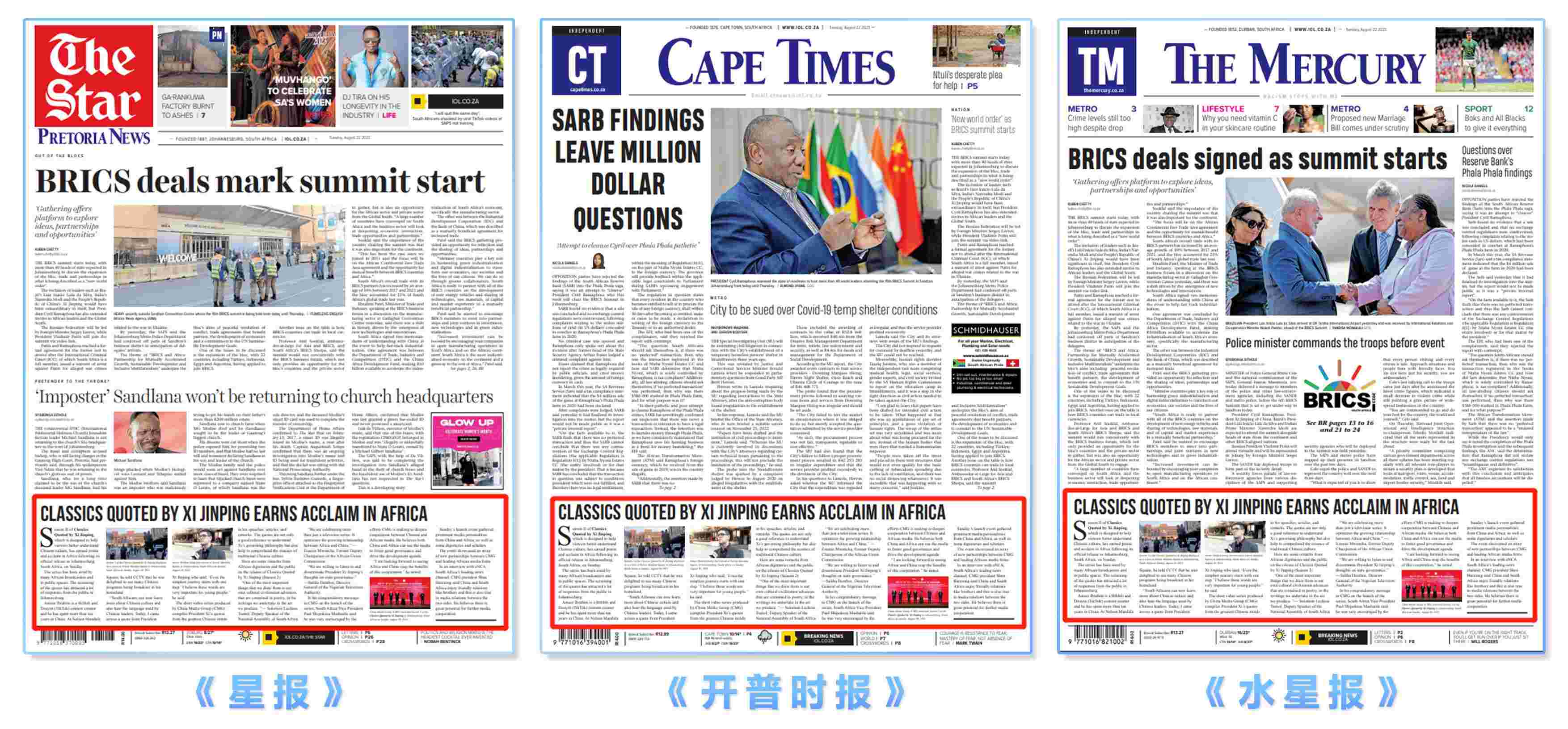 8月22日出版的南非三大主流報(bào)刊南非《星報(bào)》、《開(kāi)普時(shí)報(bào)》、《水星報(bào)》,連續(xù)第二天在頭版顯著位置發(fā)表文章。文章指出,《平“語(yǔ)”近人——習(xí)近平喜歡的典故》第二季周日(8月20日)在南非約翰內(nèi)斯堡正式發(fā)布后,在非洲贏得了廣泛好評(píng)。系列節(jié)目已經(jīng)在多家非洲廣播公司播出,并在公共場(chǎng)所大屏幕展示,這些語(yǔ)錄吸引了大量非洲受眾觀看并獲得積極反響。