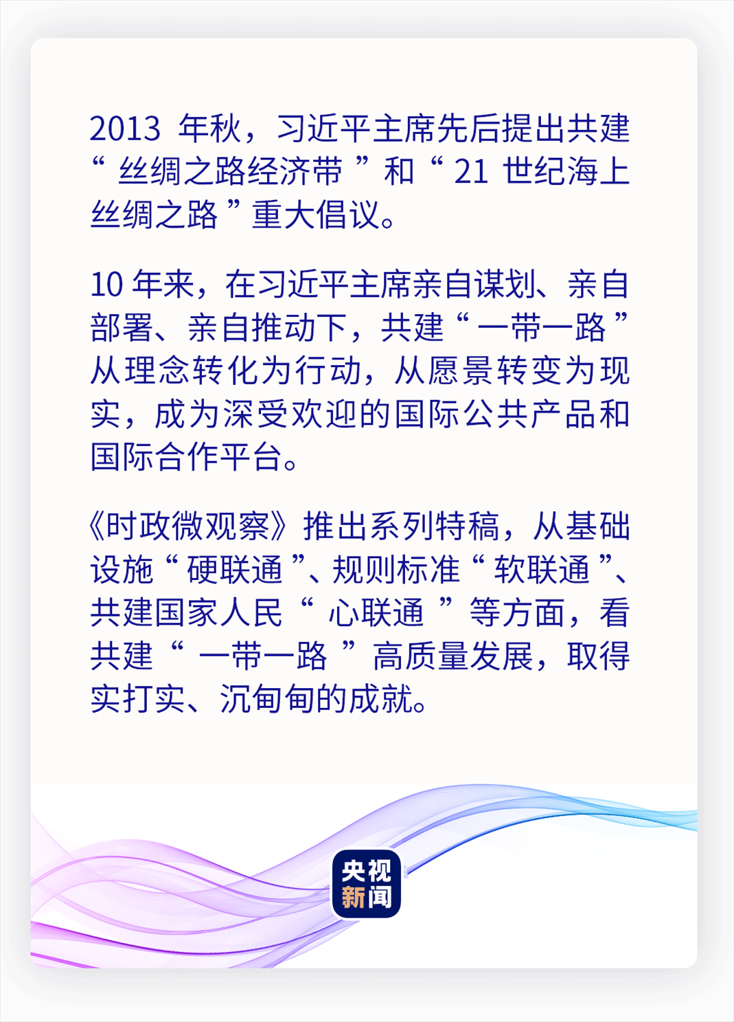 10年來,中國與共建國家以基礎(chǔ)設(shè)施“硬聯(lián)通”為重要方向,攜手前行。在“鋼鐵駝隊”的汽笛聲里、在跨海大橋上的車流中、在“空中絲綢之路”的萬米高空、在“數(shù)字絲綢之路”的“云端”……一條條幸福路、繁榮路,鋪就一幅共建“一帶一路”的壯闊畫卷。