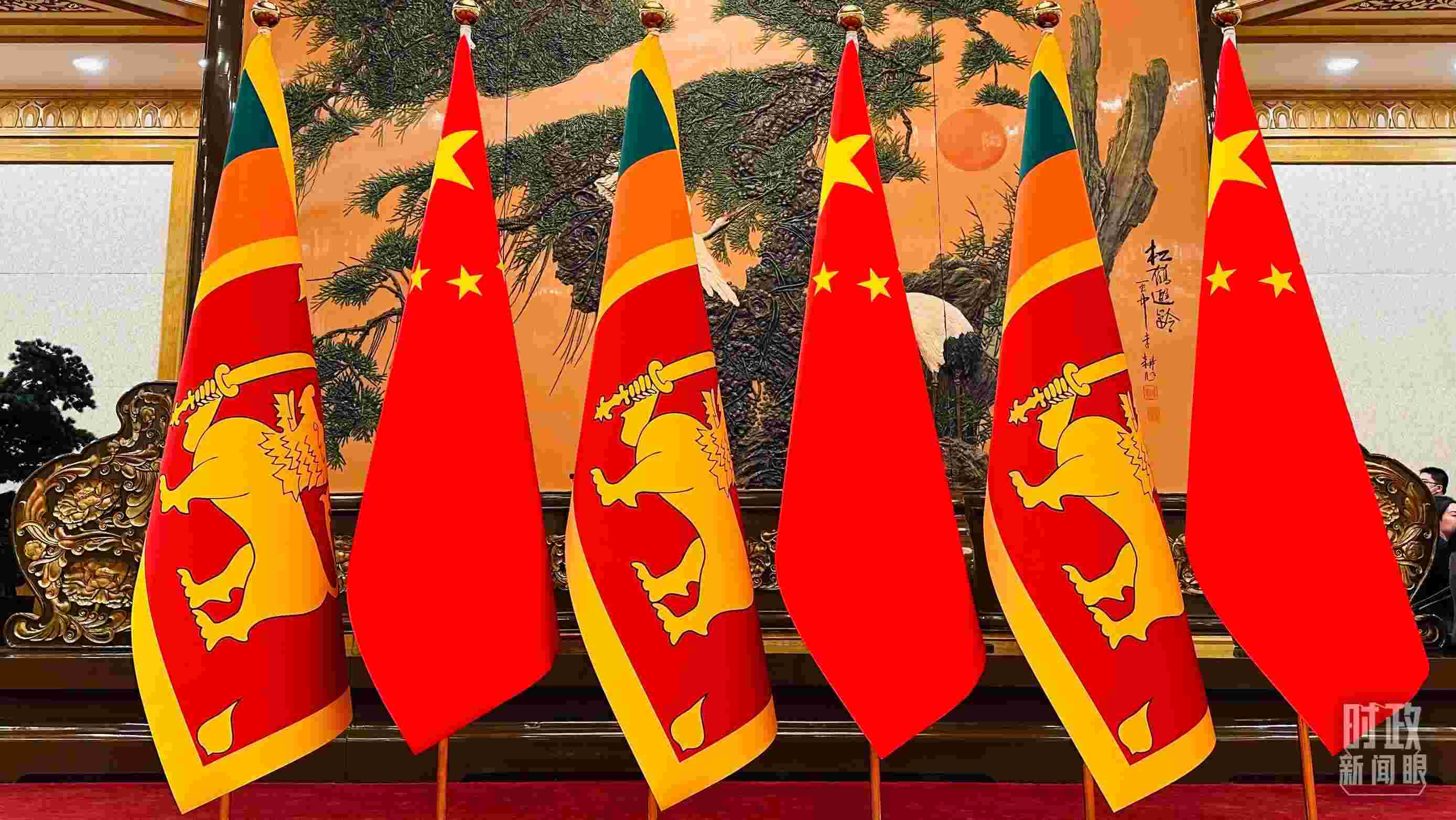 △會見現(xiàn)場擺放的中國、斯里蘭卡國旗。(總臺央視記者范一鳴拍攝)