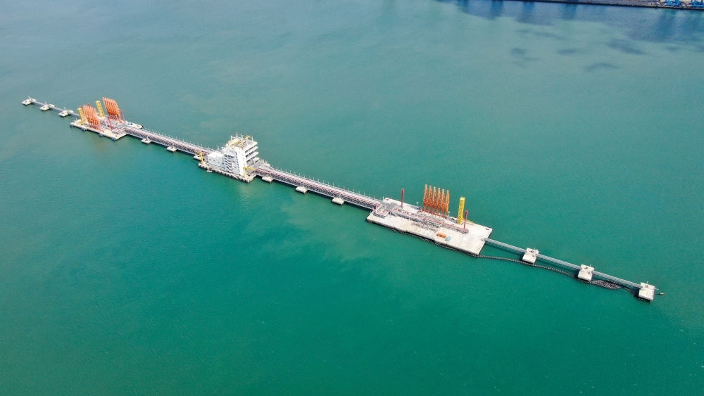 這是肯尼亞蒙巴薩油碼頭(2023年9月20日攝,無人機(jī)照片)。新華社發(fā)(中國交通建設(shè)股份有限公司肯尼亞蒙巴薩新建油碼頭項(xiàng)目部供圖)