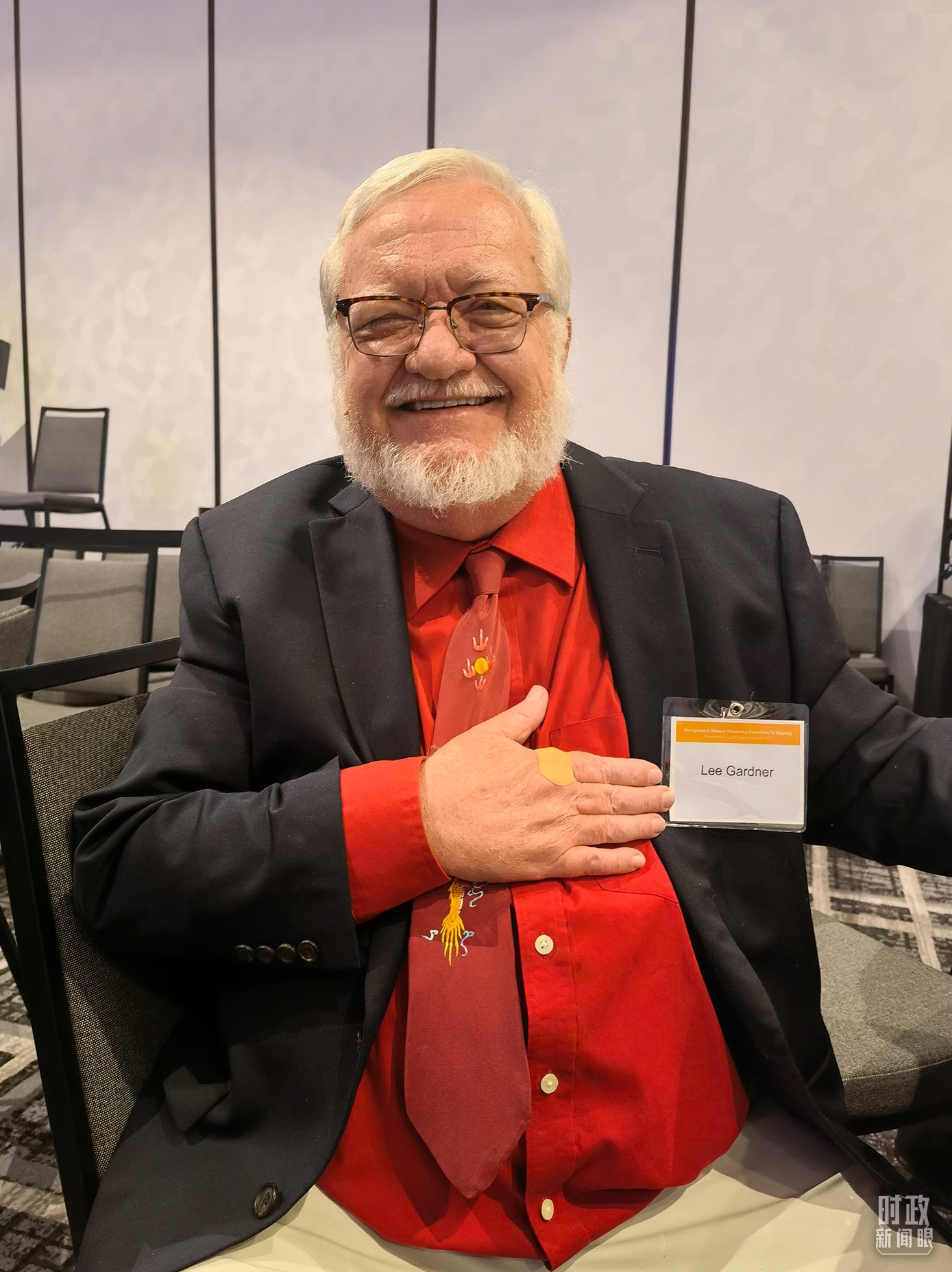 年逾70歲的李·加德納,是“鼓嶺故事”主人公密爾頓·加德納的侄孫。當(dāng)天他特意佩戴了一條繡有“中國龍”的領(lǐng)帶。(總臺央視記者石丞、國廣記者李晉拍攝)