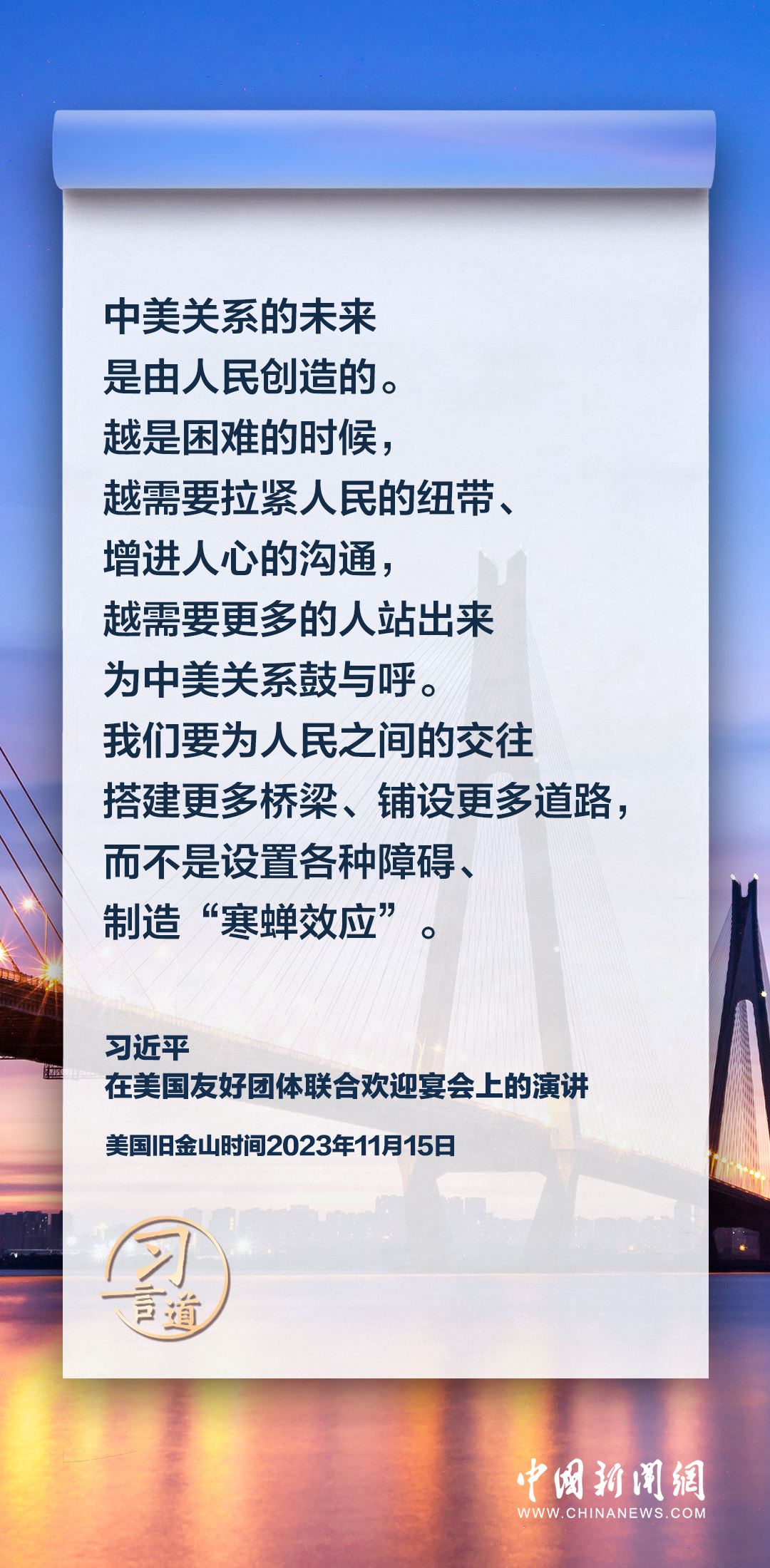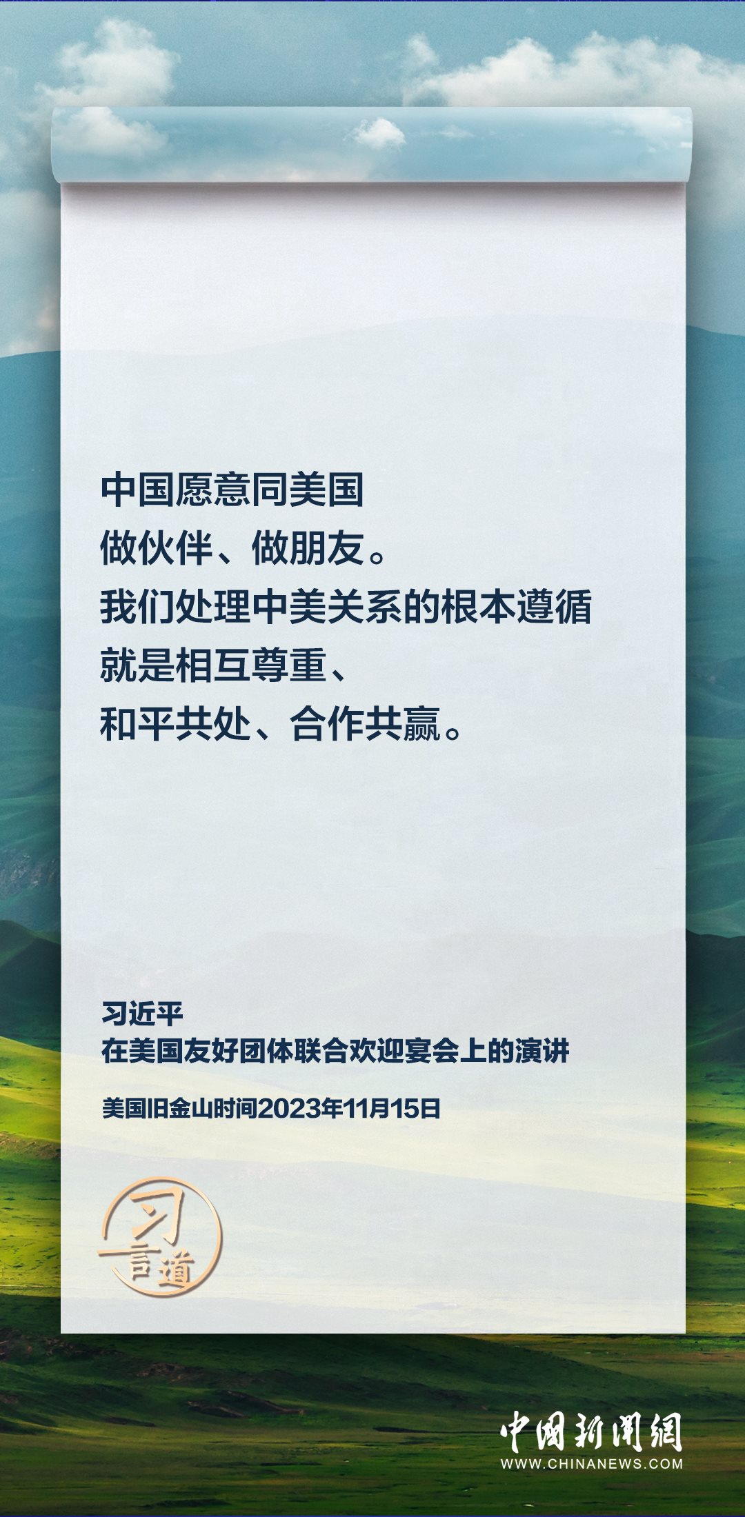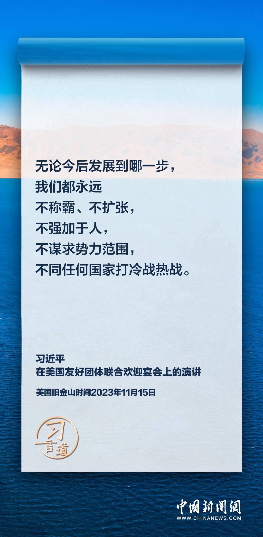 當(dāng)?shù)貢r(shí)間11月15日,中國(guó)國(guó)家主席習(xí)近平在美國(guó)舊金山出席美國(guó)友好團(tuán)體聯(lián)合歡迎宴會(huì)并發(fā)表演講。習(xí)近平在演講中從“我”和“我們”說起,提出中國(guó)主張、表明中國(guó)立場(chǎng)、展現(xiàn)大國(guó)擔(dān)當(dāng),話語擲地有聲。