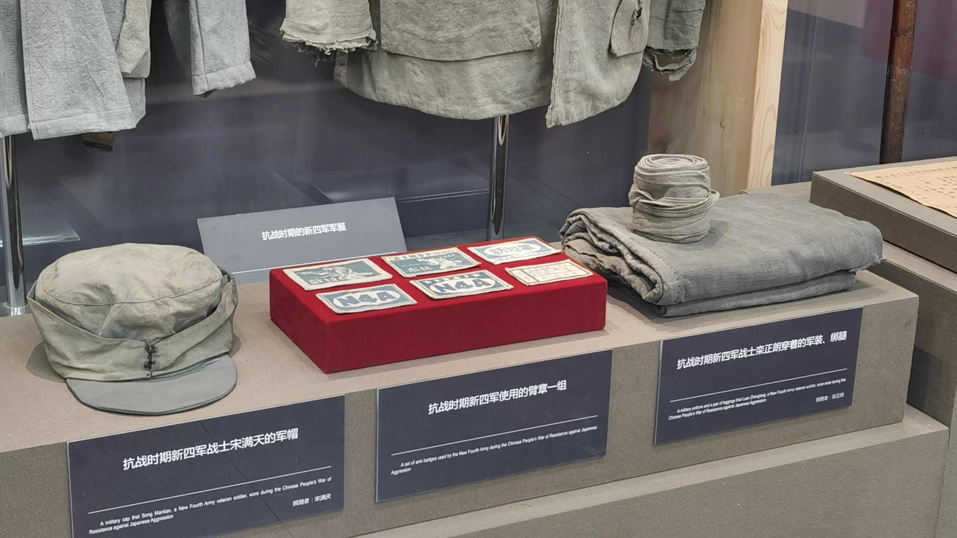 △抗戰(zhàn)時期新四軍使用的軍帽、臂章等。(總臺央視記者郭鴻拍攝)