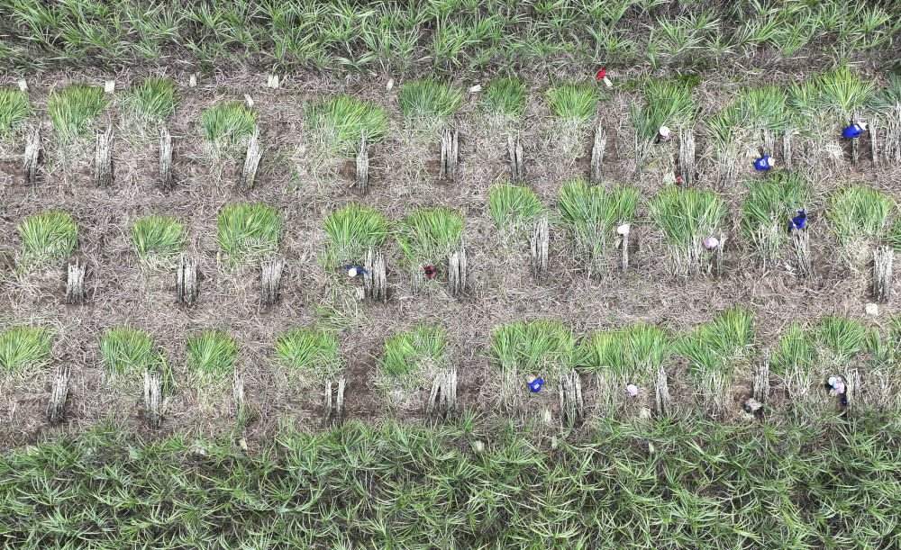 2023年12月12日,在廣西來賓市興賓區(qū)小平陽鎮(zhèn),農(nóng)民在收割甘蔗(無人機(jī)照片)。新華社記者 周華 攝