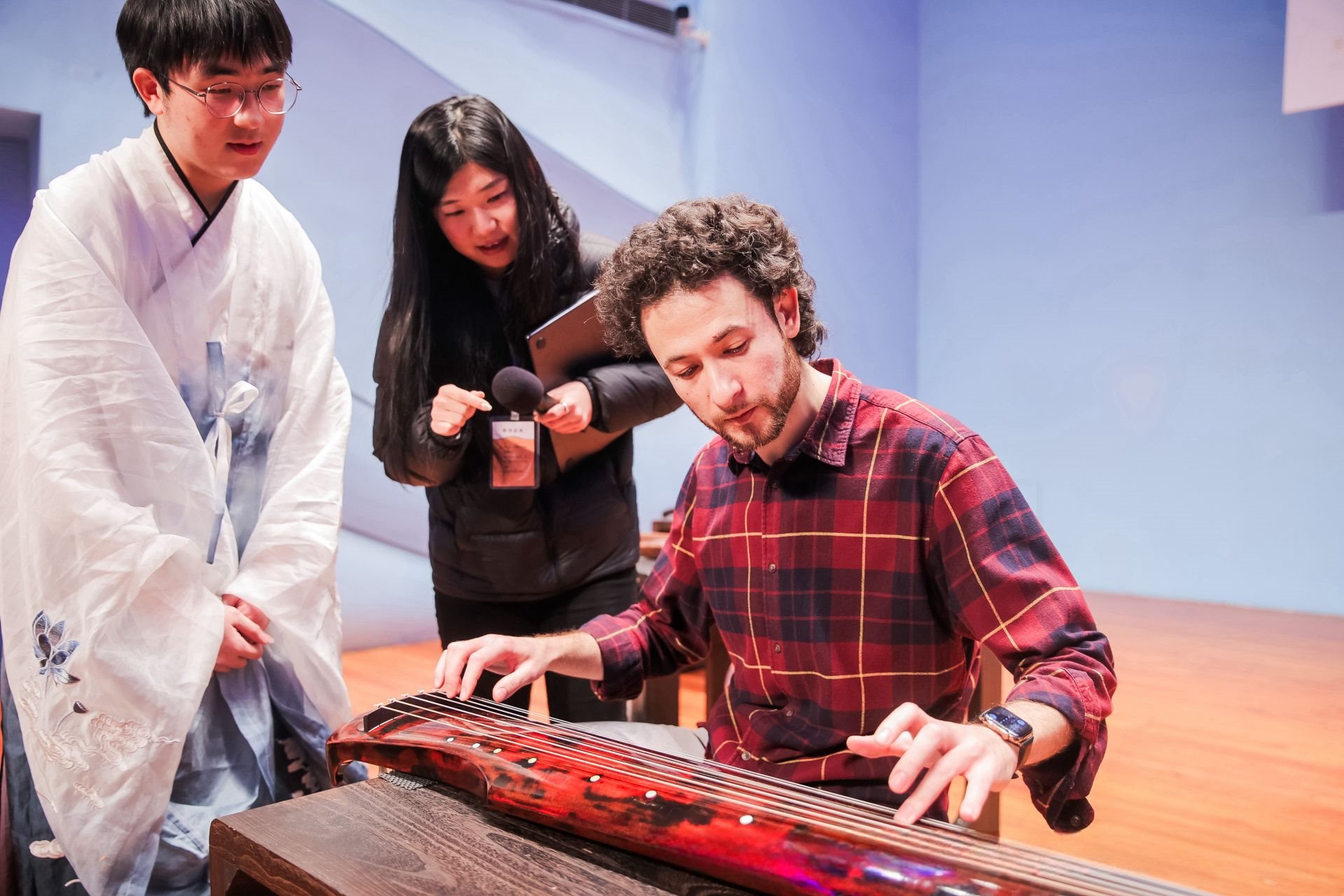 (▲俄羅斯圣彼得堡交響樂團(tuán)指揮迪米特里斯·博蒂尼斯體驗(yàn)中國古琴)