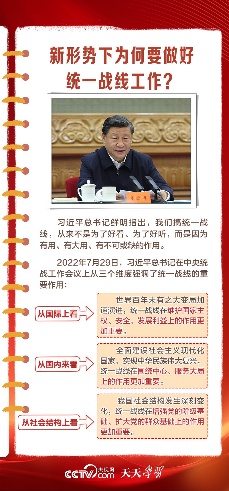 在百余年的奮斗歷程中,我們黨始終把統(tǒng)一戰(zhàn)線擺在重要位置,讓團結(jié)的旋律始終高昂,共同奮斗的力量始終激蕩。從“重要法寶”到“強大法寶”,體現(xiàn)出總書記對黨的統(tǒng)戰(zhàn)工作一以貫之的高度重視。