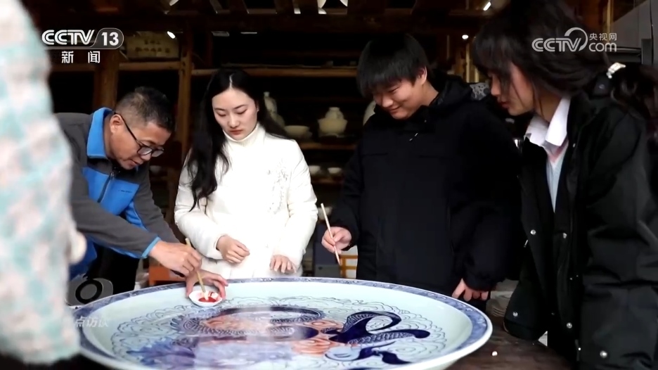 春節(jié)將近,景德鎮(zhèn)青花瓷畫坯技藝非遺傳承人孫立新和徒弟們正在制作迎接新年的龍盤,要在這個直徑1米的瓷盤上用龍的造型呈現出福字。