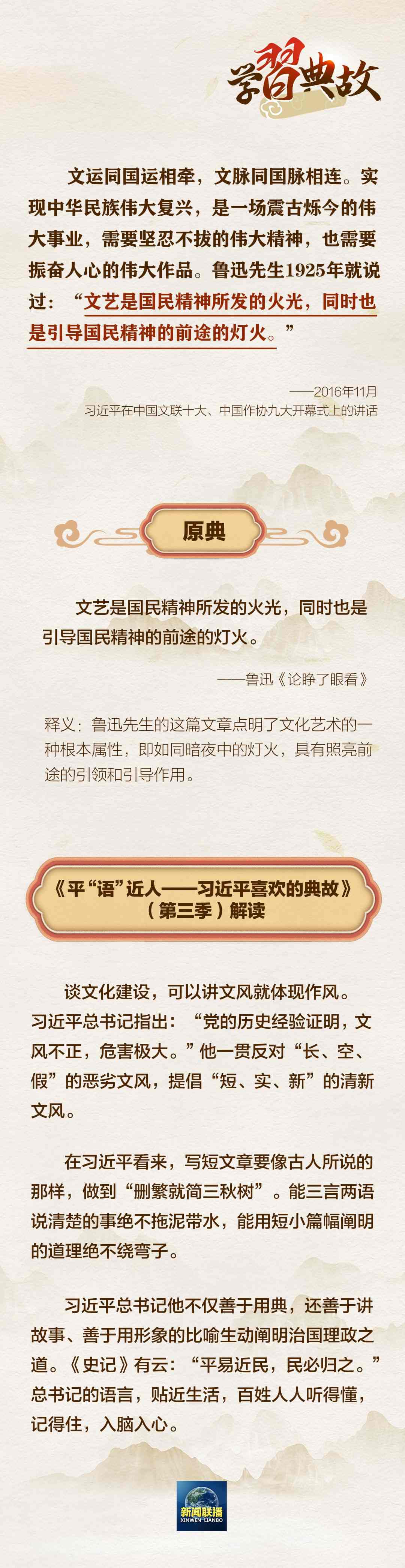 文運(yùn)同國(guó)運(yùn)相牽,文脈同國(guó)脈相連。文化自信是一個(gè)國(guó)家、一個(gè)民族發(fā)展中,最基本、最深沉、最持久的力量。黨的二十大報(bào)告中指出:“全面建設(shè)社會(huì)主義現(xiàn)代化國(guó)家,必須堅(jiān)持中國(guó)特色社會(huì)主義文化發(fā)展道路?!眹@“文化建設(shè)”這一主題,總書記曾講到哪些典故?一起學(xué)習(xí)↓↓↓