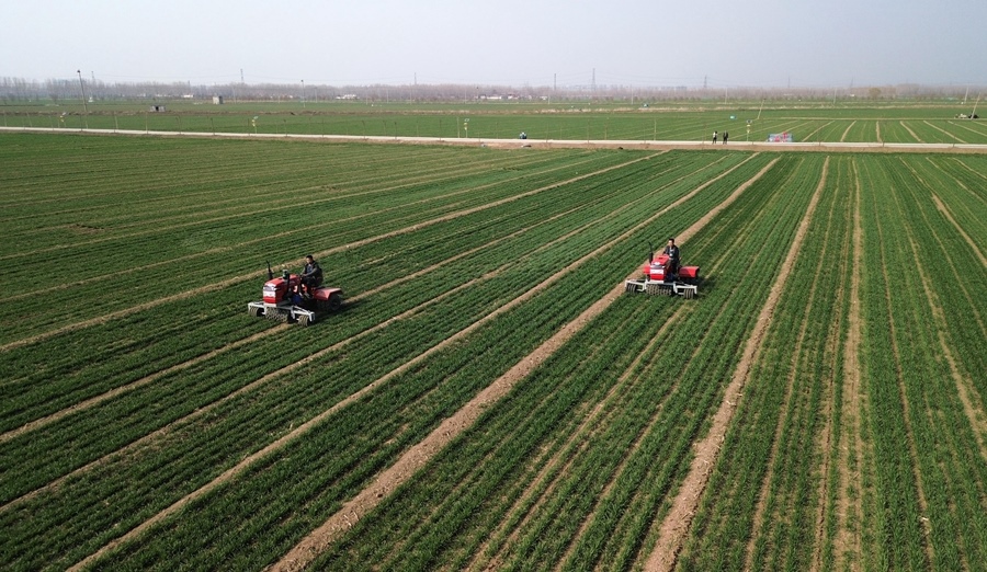 山東省汶上縣,農(nóng)民駕駛農(nóng)機在高標(biāo)準(zhǔn)農(nóng)田里進(jìn)行小麥春季管護(hù)作業(yè)(2024年3月13日攝,無人機照片)。新華社記者 徐速繪 攝
