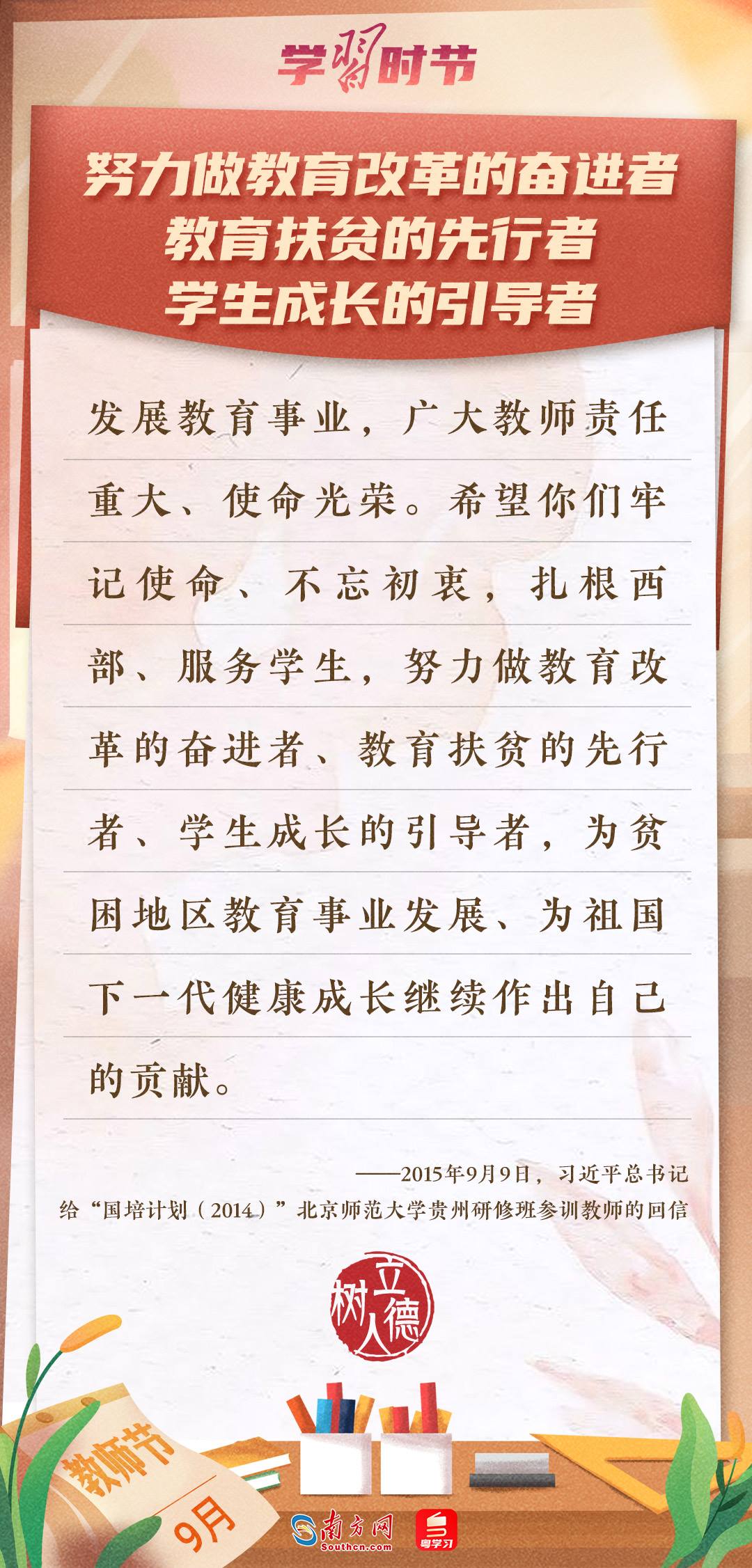 “百年大計(jì),教育為本。教育大計(jì),教師為本?!秉h的十八大以來,習(xí)近平總書記多次以書信形式向教師群體和教育工作者表達(dá)囑托與期望,諄諄話語,催人奮進(jìn)。在第四十個(gè)教師節(jié)到來之際,讓我們一起重溫總書記的諄諄寄語!