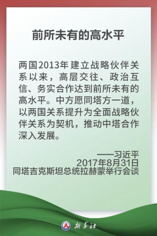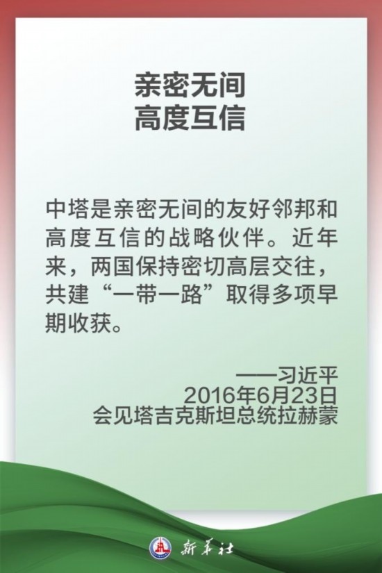 中國和塔吉克斯坦山水相連,兩國人民友好交往源遠流長。中塔建交30年多來,兩國關系取得跨越式發(fā)展,達到全面戰(zhàn)略伙伴關系的歷史性高度。塔方最早同中方簽署共建“一帶一路”合作倡議,雙方率先建立發(fā)展共同體和安全共同體。