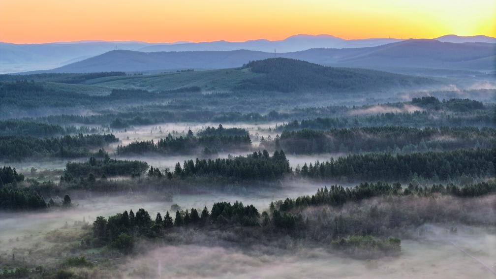 7月5日清晨,位于河北省承德市的塞罕壩國(guó)家森林公園雨后晨霧飄渺、滿目青翠(無(wú)人機(jī)照片)。