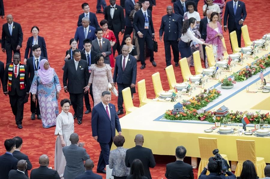 △2024年9月5日,習近平主席在北京人民大會堂出席中非合作論壇北京峰會開幕式并發(fā)表主旨講話。這是習近平主席同外方領導人共同步入會場。