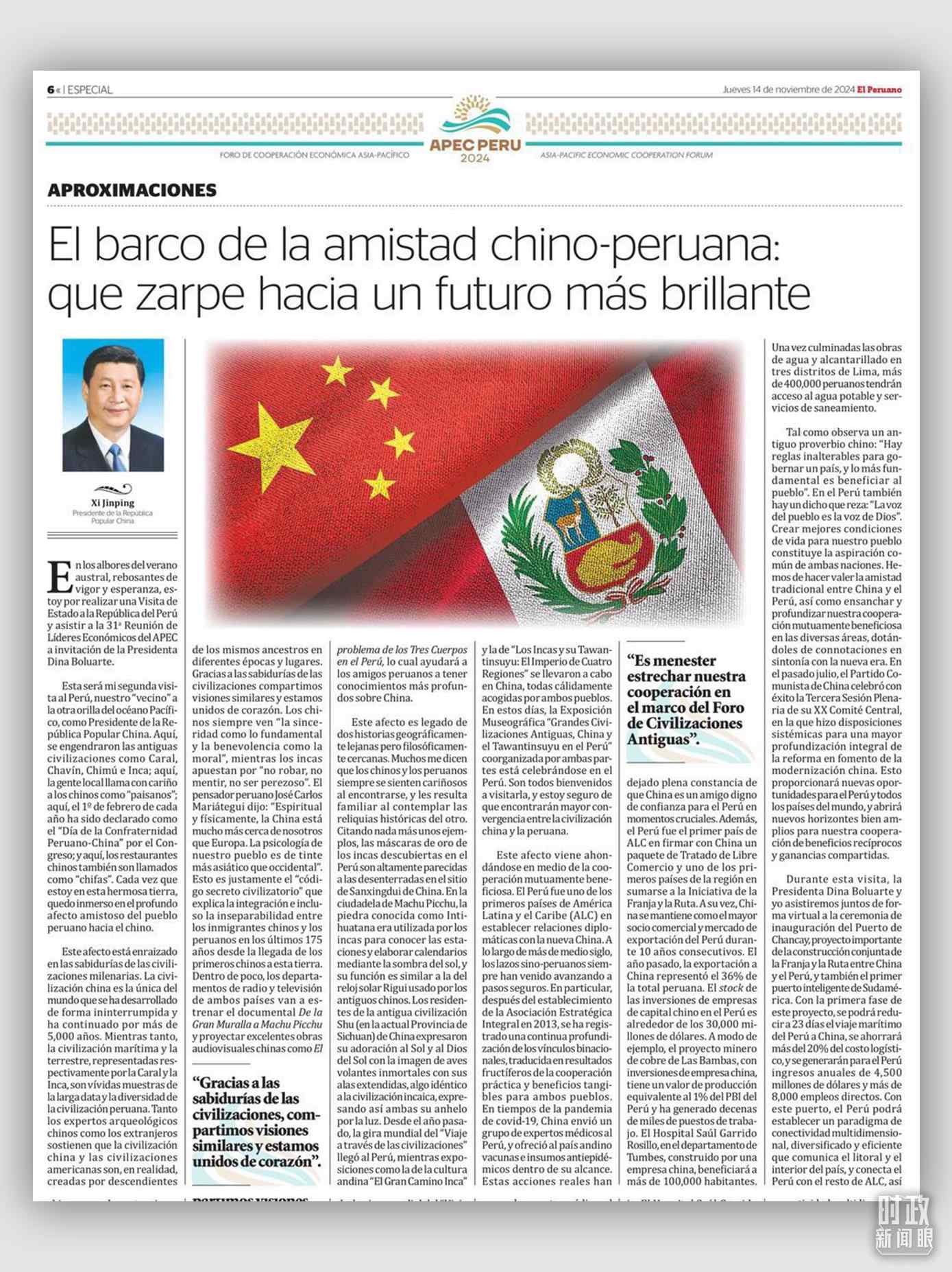 △習(xí)主席在《秘魯人報(bào)》發(fā)表題為《讓中秘友好之船揚(yáng)帆遠(yuǎn)航》的署名文章。(總臺(tái)國(guó)廣記者吳倩)