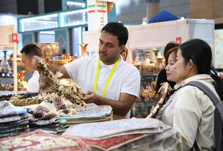 2024年9月20日,在陜西省西安市舉行的第八屆絲綢之路國(guó)際博覽會(huì)上,來自伊朗的參展商(前左一)向觀眾介紹產(chǎn)品。 新華社記者 張博文 攝