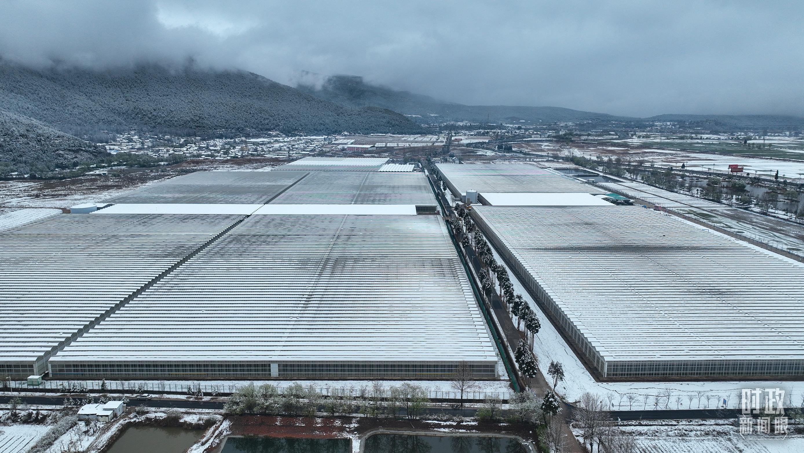 △銀裝素裹的麗江現(xiàn)代花卉產(chǎn)業(yè)園。(總臺央視記者郭鴻拍攝)
