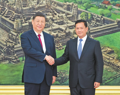 習(xí)近平指出,中柬鐵桿友誼擁有深厚歷史積淀、牢固政治基礎(chǔ)、強(qiáng)大內(nèi)生動力。無論國際風(fēng)云如何變化,兩國始終走在構(gòu)建人類命運(yùn)共同體前列。當(dāng)前,世界百年變局加速演進(jìn),深化中柬命運(yùn)共同體建設(shè)完全符合兩國人民根本利益。中方將一如既往支持柬埔寨走符合本國國情的發(fā)展道路,支持柬埔寨政府順利施政,支持柬方在國際和地區(qū)事務(wù)中發(fā)揮更加重要作用。雙方要以構(gòu)建新時代全天候中柬命運(yùn)共同體為新起點(diǎn),乘勢而上,繼續(xù)落實(shí)好新版中柬命運(yùn)共同體行動計(jì)劃,加強(qiáng)團(tuán)結(jié)合作,加快落實(shí)全球發(fā)展倡議、全球安全倡議、全球文明倡議,深化更高水平政治互信,拓展更高質(zhì)量互利合作,筑牢更高層次安全保障,開展更高頻率人文交流,強(qiáng)化更高標(biāo)準(zhǔn)戰(zhàn)略協(xié)作,更好造福兩國人民。