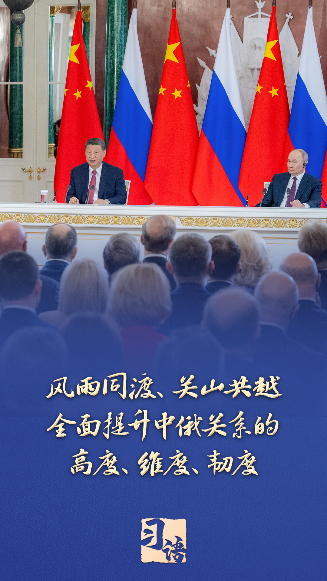 “面對(duì)變亂交織的國(guó)際形勢(shì),中俄兩國(guó)要堅(jiān)定秉持永久睦鄰友好、全面戰(zhàn)略協(xié)作、互利合作共贏精神,風(fēng)雨同渡、關(guān)山共越,全面提升中俄關(guān)系的高度、維度、韌度,為世界和平和安全注入更多穩(wěn)定性,為全球發(fā)展繁榮提供更強(qiáng)推動(dòng)力?!碑?dāng)?shù)貢r(shí)間5月8日,習(xí)近平在同俄羅斯總統(tǒng)普京共同會(huì)見(jiàn)記者時(shí)指出。