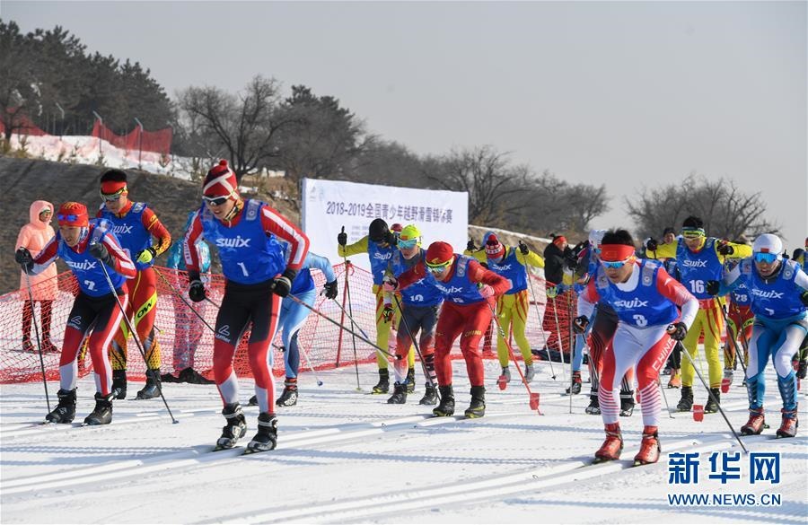1月12日,參賽選手在青年組男子30公里集體出發(fā)(自由技術(shù))比賽中。1月11日至1月15日,2018-2019年度全國青少年越野滑雪錦標(biāo)賽在內(nèi)蒙古烏蘭察布市涼城縣岱?;﹫雠e行。新華社記者彭源攝