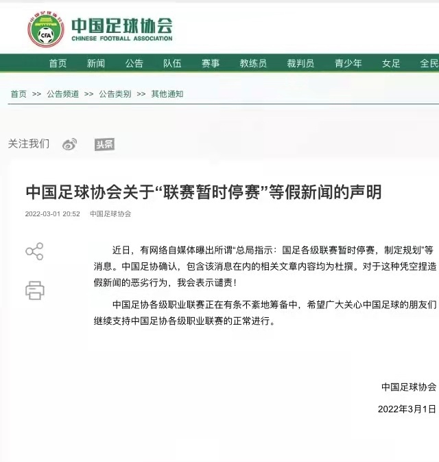 “近日,有網(wǎng)絡(luò)自媒體曝出所謂‘(體育)總局指示:國足各級聯(lián)賽暫時停賽,制定規(guī)劃’等消息。中國足協(xié)確認(rèn),包含該消息在內(nèi)的相關(guān)文章內(nèi)容均為杜撰。對于這種憑空捏造假新聞的惡劣行為,我會表示譴責(zé)!”中國足協(xié)在聲明中說。