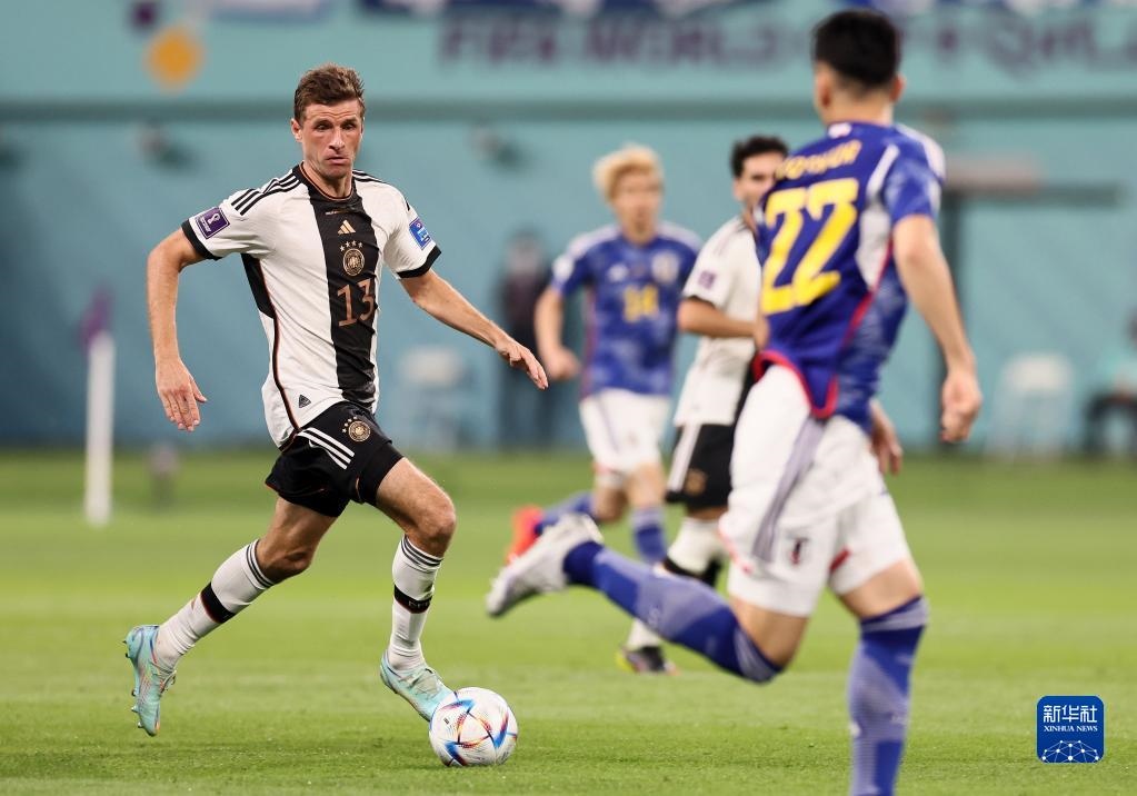 11月23日,德國隊(duì)球員托馬斯·穆勒(左)在比賽中進(jìn)攻。新華社記者 蘭紅光 攝