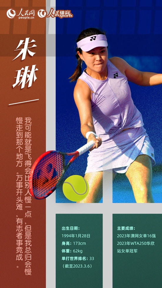 今年年初,29歲的朱琳給自己定了新賽季兩個目標(biāo):拿一個WTA巡回賽單打冠軍、世界排名進(jìn)入前50位。朱琳在澳網(wǎng)接連戰(zhàn)勝多位好手,首次闖進(jìn)大滿貫女單16強(qiáng)。2月5日,在WTA華欣站女單決賽中,朱琳戰(zhàn)勝烏克蘭選手特蘇倫科,獲得職業(yè)生涯首個WTA女單冠軍,同時世界排名上升至41位,創(chuàng)造個人最佳成績。僅用了一個月,她就實(shí)現(xiàn)了年初制定的目標(biāo)。上周,朱琳打進(jìn)WTA250蒙特雷站4強(qiáng),將排名提升至第33位,再創(chuàng)個人新高。相信在未來的賽場上,“大器晚成”的朱琳還將創(chuàng)造更多的驚喜。