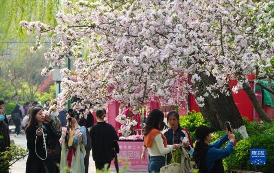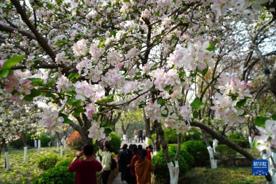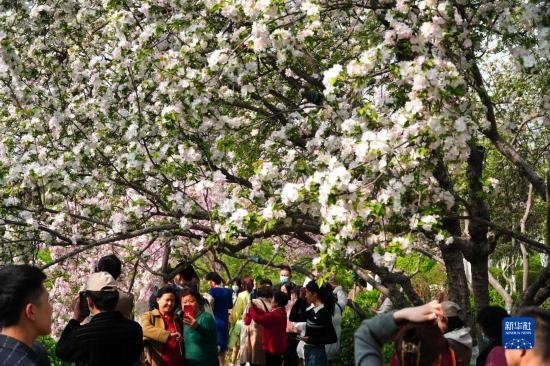 3月21日,在濟(jì)南市五龍?zhí)豆珗@,人們觀賞盛開(kāi)的海棠花。