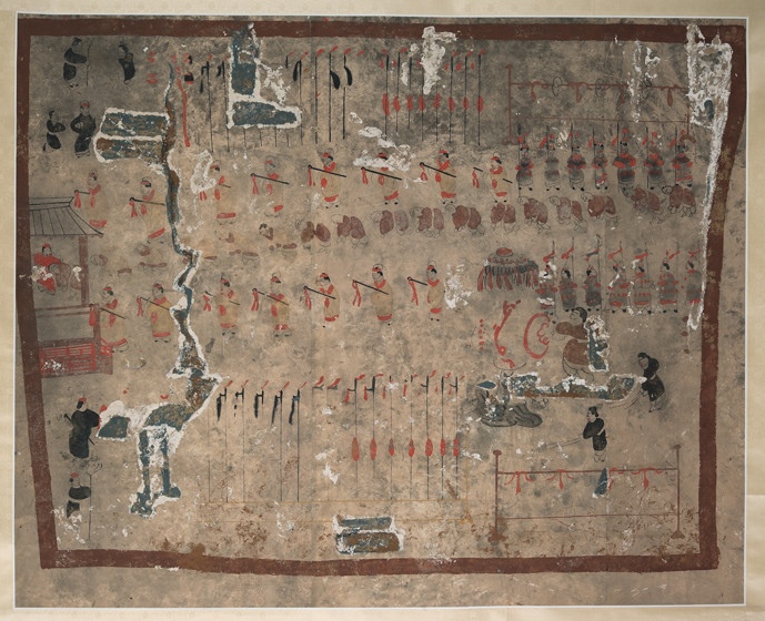 再繞回前室中層,橫跨東北西3面墓壁即是《護(hù)烏桓校尉出行圖》。墓主人所乘軺車,駕3匹黑馬,榜題“使持節(jié)護(hù)烏桓校尉”等字,主車前后有鼓車、斧車,層層環(huán)護(hù)眾多武官、兵丁,隨從有“別駕從事”“功曹從事”“校尉行部”等下屬官職,連車列騎,旗旌飄揚(yáng),場(chǎng)面極為壯觀。中室東壁下半部描繪的是《寧城圖》與《護(hù)烏桓校尉幕府圖》?!秾幊菆D》畫有城垣、城門、衙署等內(nèi)容,其中寧城南門外武士持戟列隊(duì)、身著胡服的少數(shù)民族人物徐徐入內(nèi)的場(chǎng)景最為突出。占據(jù)主畫面的是《護(hù)烏桓校尉幕府圖》,由于任護(hù)烏桓校尉官職是墓主人一生中最值得炫耀的經(jīng)歷,所以,此圖描繪得最為詳細(xì)夸張,是整個(gè)壁畫中的核心部分。整個(gè)幕府分為堂院、營(yíng)舍和庖舍3個(gè)部分,堂屋為高大的廡殿式房屋,墓主人端坐堂上,堂下藝人在表演樂舞雜耍,少數(shù)民族人物伏拜覲見,周圍環(huán)立官吏武士,場(chǎng)面喧囂隆重。營(yíng)舍位于幕府后院,是幕府中管理軍務(wù)的機(jī)構(gòu)所在,庖舍位于幕府的西南角,掌管幕府廚飲之事。